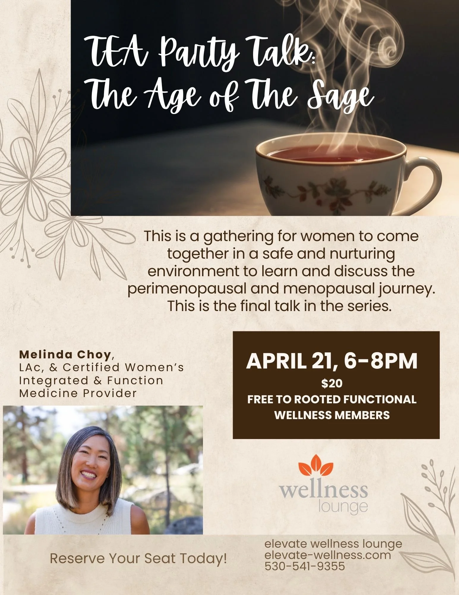 This is a gathering for women to come together in a safe and nurturing environment to learn about the perimenopausal and menopausal journey. Melinda Choy, Licensed Acupuncturist and Women’s Integrative & Functional Medicine Certified Practitioner will lead you on a lively discussion on how the biological changes during this time is truly a guide to greater wisdom, freedom and transition.